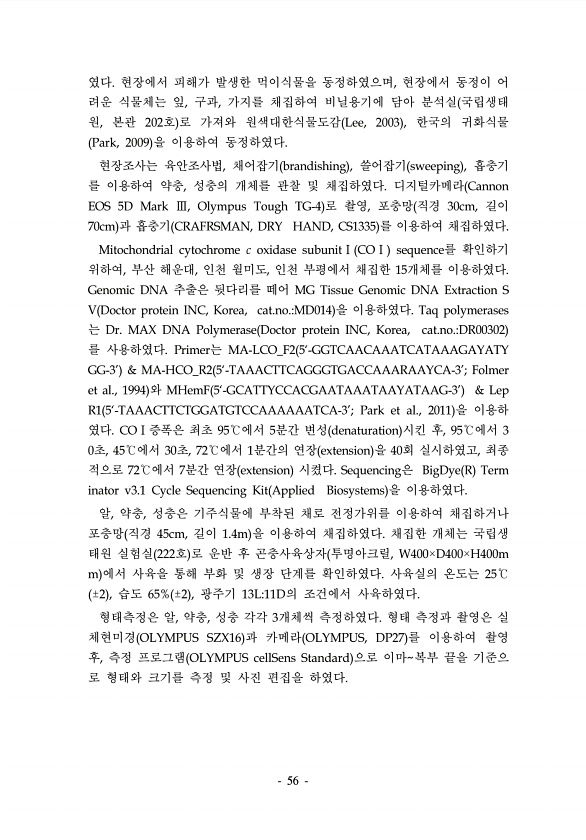 56 였다. 현장에서 피해가 발생한 먹이식물을 동정하였으며, 현장에서 동정이 어 려운 식물체는 잎, 구과, 가지를 채집하여 비닐용기에 담아 분석실 국립생태 원, 본관 202호 로 가져와 원색대한식물도감 Lee, 2003 , 한국의 귀화식물 Park, 2009 을 이용하여 동정하였다. 현장조사는 육안조사법, 채어잡기 brandishing , 쓸어잡기 sweeping , 흡충기 를 이용하여 약충, 성충의 개체를 관찰 및 채집하였다. 디지털카메라 Cannon EOS 5D Mark Ⅲ, Olympus Tough TG-4 로 촬영, 포충망 직경 30cm, 길이 70cm 과 흡충기 CRAFRSMAN, DRY HAND, CS1335 를 이용하여 채집하였다. Mitochondrial cytochrome c oxidase ...