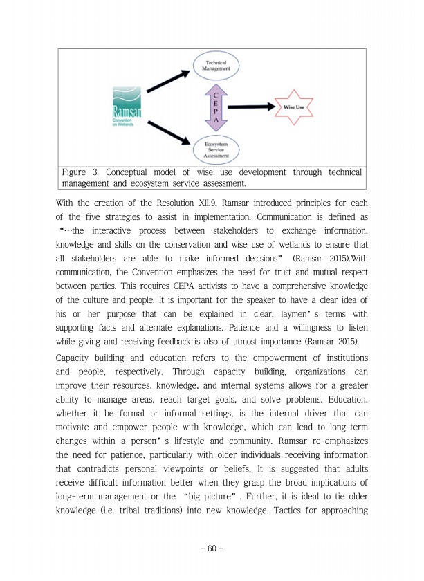 60 Figure 3. Conceptual model of wise use development through technical management and ecosystem service assessment. With the creation of the Resolution XII.9, Ramsar introduced principles for each of the five strategies to assist in implementation. Communication is defined as “…the interactive process between stakeholders to exchange information, knowledge and skills on the conservation and wise ...