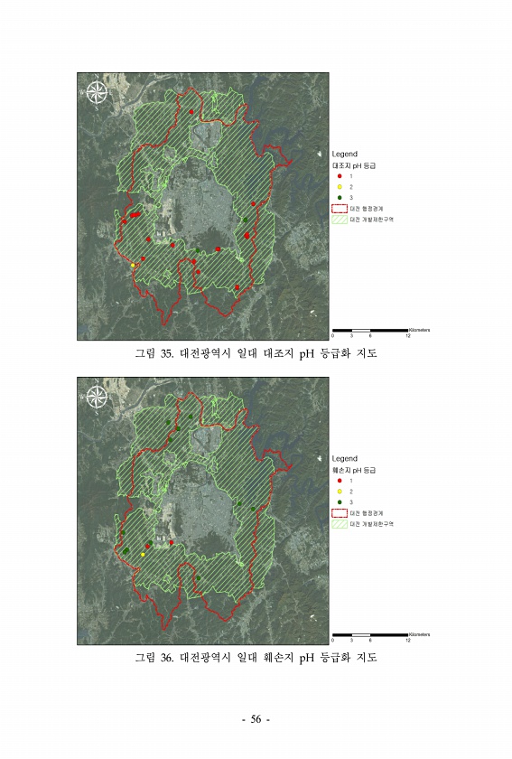 그림 35. 대전광역시 일대 대조지 pH 등급화 지도 그림 36. 대전광역시 일대 훼손지 pH 등급화 지도 56