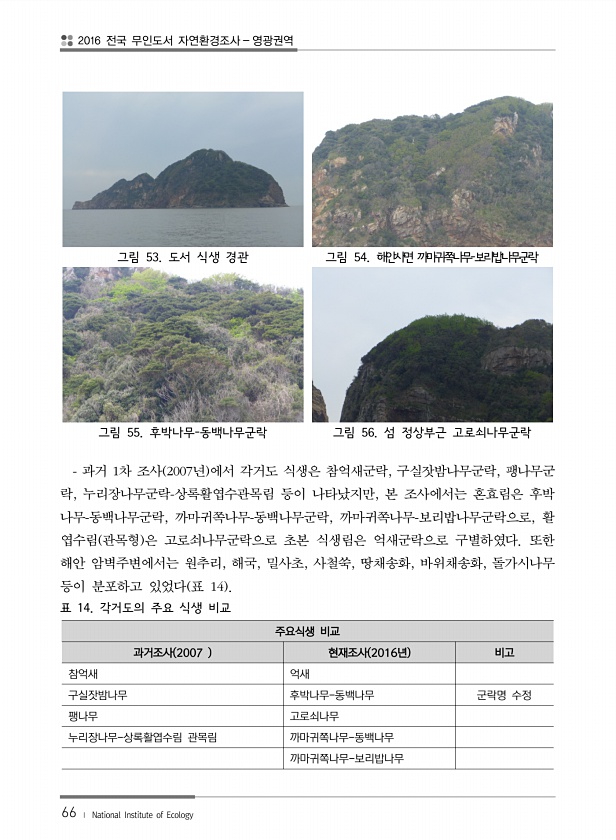 2016 전국 무인도서 자연환경조사 영광권역 66 ? National Institute of Ecology 그림 53. 도서 식생 경관 그림 54. 해안사면 까마귀쪽나무-보리밥나무군락 그림 55. 후박나무-동백나무군락 그림 56. 섬 정상부근 고로쇠나무군락 과거 1차 조사 2007년 에서 각거도 식생은 참억새군락, 구실잣밤나무군락, 팽나무군 락, 누리장나무군락-상록활엽수관목림 등이 나타났지만, 본 조사에서는 혼효림은 후박 나무-동백나무군락, 까마귀쪽나무-동백나무군락, 까마귀쪽나무-보리밥나무군락으로, 활 엽수림 관목형 은 고로쇠나무군락으로 초본 식생림은 억새군락으로 구별하였다. 또한 해안 암벽주변에서는 원추리, 해국, 밀사초, 사철쑥, 땅채송화, 바위채송화, 돌가시나무 등이 분포하고 있었다 표 14 표 14....