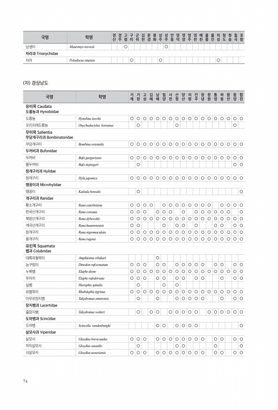 74 남생이 Mauremys reevesii ○ ○ 자라과 Trionychidae 자라 Pelodiscus sinensis ○ ○ ○ 자 경상남도 국명 학명 거 제 거창 고성 김해 남해 밀양 사천 산청 양산 의령 진주 창녕 창원 통영 하동 함안 함양 합천 유미목 Caudata 도롱뇽과 Hynobiidae 도롱뇽 Hynobius leechii ○ ○ ○ ○ ○ ○ ○ ○ ○ ○ ○ ○ ○ ○ ○ ○ ○ ○ 꼬리치레도롱뇽 Onychodactylus koreanus ○ ○ ○ 무미목 Salientia 무당개구리과 Bombinatoridae 무당개구리 Bombina orientalis ○ ○ ○ ○ ○ ○ ○ ○ ○ ○ ○ ○ ○ ○ ○ ○ ○ ○ 두꺼비과 Bufonidae 두꺼비 Bufo gargarizans ○...