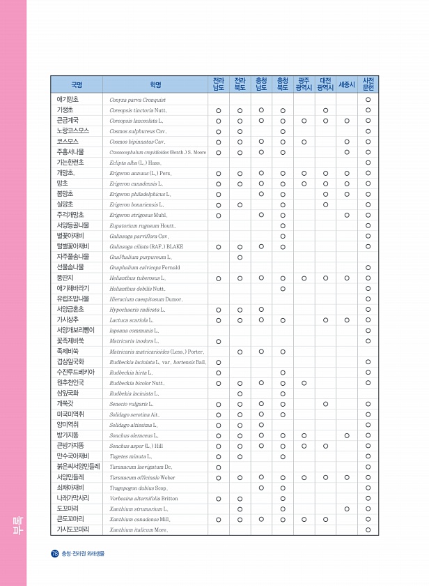 부록 78 충청?전라권 외래생물 ○○○○○ ○ ○ ○ ○ ○ ○ ○ ○○ ○ ○○○ ○○○○○○○ ○ ○ ○ ○○○○○ ○ ○ ○ ○○ ○ ○○ ○ ○○○○○○○ ○ ○ ○○○ ○○○○○ ○ ○ ○ ○ ○ ○ ○ ○ ○○ ○ ○ ○○○○○ ○○ ○ ○○○○○ ○ ○ ○ ○ ○ ○ ○○ ○ ○ ○○ ○ ○ ○ ○ ○ ○ ○ ○ ○ ○ ○ ○ ○ ○ ○ ○ ○ ○ ○ ○ ○ ○ ○○○○○○○○○○○○ ○ ○○ ○○○○○○○○ ○○○ ○○○○○ ○ ○○○○○○○ ○○ ○ ○ ○ ○ ○ ○ ○ ○ ○○ ○ ○ ○○ ○ ○○ ○○ ○ 국명 학명 애기망초 기생초 큰금계국 노랑코스모스 코스모스 주홍서나물 가는한련초 개망초. 망초 봄망초 실망초 주걱개망초 서양등골나물 별꽃아재비 털별꽃아재비 자주풀솜나물 선풀솜나물 뚱딴지 ...