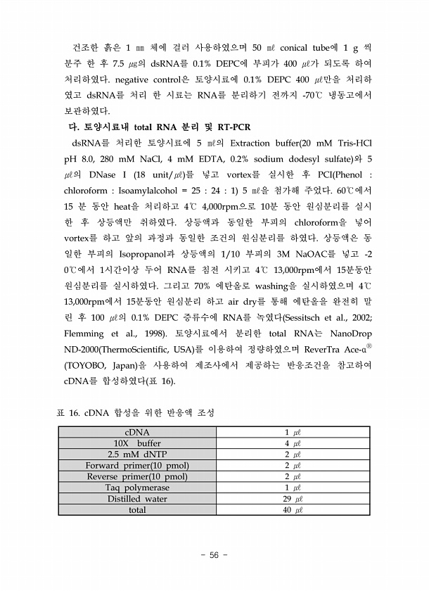 cDNA 1 ㎕ 10X buffer 4 ㎕ 2.5 mM dNTP 2 ㎕ Forward primer 10 pmol 2 ㎕ Reverse primer 10 pmol 2 ㎕ Taq polymerase 1 ㎕ Distilled water 29 ㎕ total 40 ㎕ 건조한 흙은 1 ㎜ 체에 걸러 사용하였으며 50 ㎖ conical tube에 1 g 씩 분주 한 후 7.5 ㎍의 dsRNA를 0.1% DEPC에 부피가 400 ㎕가 되도록 하여 처리하였다. negative control은 토양시료에 0.1% DEPC 400 ㎕만을 처리하 였고 dsRNA를 처리 한 시료는 RNA를 분리하기 전까지 -70℃ 냉동고에서 보관하였다. 다. 토양시료내 total RNA 분리 및 RT-PCR dsRNA를 처리한 토양시료에 5 ㎖의...