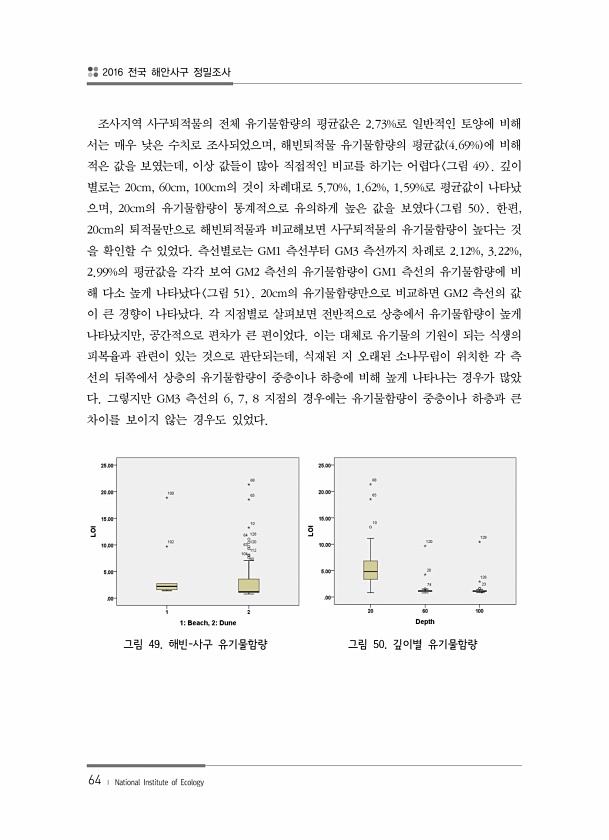 2016 전국 해안사구 정밀조사 64 ? National Institute of Ecology 조사지역 사구퇴적물의 전체 유기물함량의 평균값은 2.73%로 일반적인 토양에 비해 서는 매우 낮은 수치로 조사되었으며, 해빈퇴적물 유기물함량의 평균값 4.69% 에 비해 적은 값을 보였는데, 이상 값들이 많아 직접적인 비교를 하기는 어렵다 그림 49 깊이 별로는 20cm, 60cm, 100cm의 것이 차례대로 5.70%, 1.62%, 1.59%로 평균값이 나타났 으며, 20cm의 유기물함량이 통계적으로 유의하게 높은 값을 보였다 그림 50 한편, 20cm의 퇴적물만으로 해빈퇴적물과 비교해보면 사구퇴적물의 유기물함량이 높다는 것 을 확인할 수 있었다. 측선별로는 GM1 측선부터 GM3 측선까지 차례로 2.12%, 3...