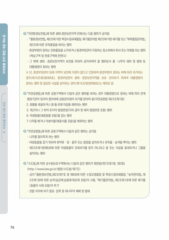 76 Ⅲ. 외래생물 종별 대응 방안 외래생물 관리 종합 대응 매뉴얼 「자연환경보전법」에 따른 생태·경관보전지역 안에서는 다음 행위가 금지됨 「물환경보전법」 제2조에 의한 특정수질유해물질, 폐기물관리법 제2조에 의한 폐기물 또는 「화학물질관리법」 제2조에 따른 유독물질을 버리는 행위 환경부령이 정하는 인화물질을 소지하거나 환경부장관이 지정하는 장소외에서 취사 또는 야영을 하는 행위 핵심구역 및 완충구역에 한한다 그 밖에 생태ㆍ경관보전지역의 보전을 위하여 금지하여야 할 행위로서 풀ㆍ나무의 채취 및 벌채 등 대통령령이 정하는 행위 ※ 단, 환경부장관이 당해 지역의 보전에 지장이 없다고 인정하여 환경부령이 정하는 바에 따라 허가하는 경우 제15조제2항제4호 , 환경부장관이 생태ㆍ경관보전지역을 보호ㆍ관리하기 위하여 ...
