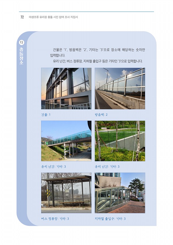 건물1 유리 난간기타3 버스 정류장기타3 방음벽2 유리 난간기타3 지하철 출입구기타3 건물은 ‘1’, 방음벽은 ‘2’, 기타는 ‘3’으로 장소에 해당하는 숫자만 입력합니다. 유리 난간, 버스 정류장, 지하철 출입구 등은 기타인 ‘3’으로 입력합니다. 다 충돌장소 72 야생조류 유리창 충돌 시민 참여 조사지침서