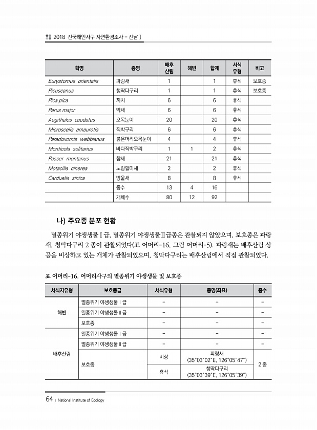 2018 전국해안사구 자연환경조사 전남Ⅰ 64 ? National Institute of Ecology 멸종위기 야생생물Ⅰ급, 멸종위기 야생생물Ⅱ급종은 관찰되지 않았으며, 보호종은 파랑 새, 청딱다구리 2 종이 관찰되었다 표 어머리-16, 그림 어머리-5 파랑새는 배후산림 상 공을 비상하고 있는 개체가 관찰되었으며, 청딱다구리는 배후산림에서 직접 관찰되었다. 서식지유형 보호등급 서식유형 종명 좌표 종수 해빈 멸종위기 야생생물Ⅰ급 멸종위기 야생생물Ⅱ급 보호종 배후산림 멸종위기 야생생물Ⅰ급 멸종위기 야생생물Ⅱ급 보호종 비상 파랑새 35°03′02″E, 126°05′47″ 2 종 휴식 청딱다구리 35°03′39″E, 126°05′39″ 표 어머리-16. 어머리사구의 멸종위기 야생생물 및 보호종 학명 종명 배후 산...