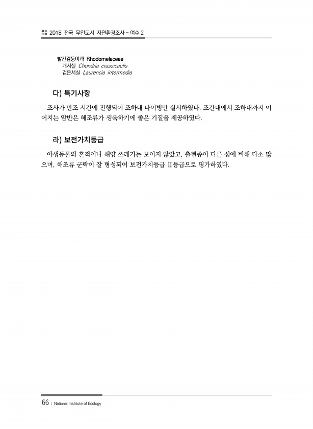 2018 전국 무인도서 자연환경조사 여수 2 66 ? National Institute of Ecology 빨간검둥이과 Rhodomelaceae 개서실 Chondria crassicaulis 검은서실 Laurencia intermedia 조사가 만조 시간에 진행되어 조하대 다이빙만 실시하였다. 조간대에서 조하대까지 이 어지는 암반은 해조류가 생육하기에 좋은 기질을 제공하였다. 야생동물의 흔적이나 해양 쓰레기는 보이지 않았고, 출현종이 다른 섬에 비해 다소 많 으며, 해조류 군락이 잘 형성되어 보전가치등급 Ⅱ등급으로평가하였다.