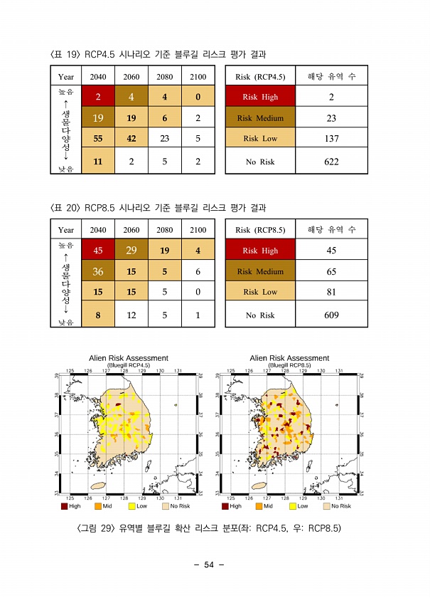 54 Year 2040 2060 2080 2100 Risk RCP4.5 해당 유역 수 높음 ↑ 생물다양성↓ 낮음 2 4 4 0 Risk High 2 19 19 6 2 Risk Medium 23 55 42 23 5 Risk Low 137 11 2 5 2 No Risk 622 표 19 RCP4.5 시나리오 기준 블루길 리스크 평가 결과 Year 2040 2060 2080 2100 Risk RCP8.5 해당 유역 수 높음 ↑ 생물다양성↓ 낮음 45 29 19 4 Risk High 45 36 15 5 6 Risk Medium 65 15 15 5 0 Risk Low 81 8 12 5 1 No Risk 609 표 20 RCP8.5 시나리오 기준 블루길 리스크 평가 결과 그림 29 유역별 블루길 확산 리스크 분포 좌RC...
