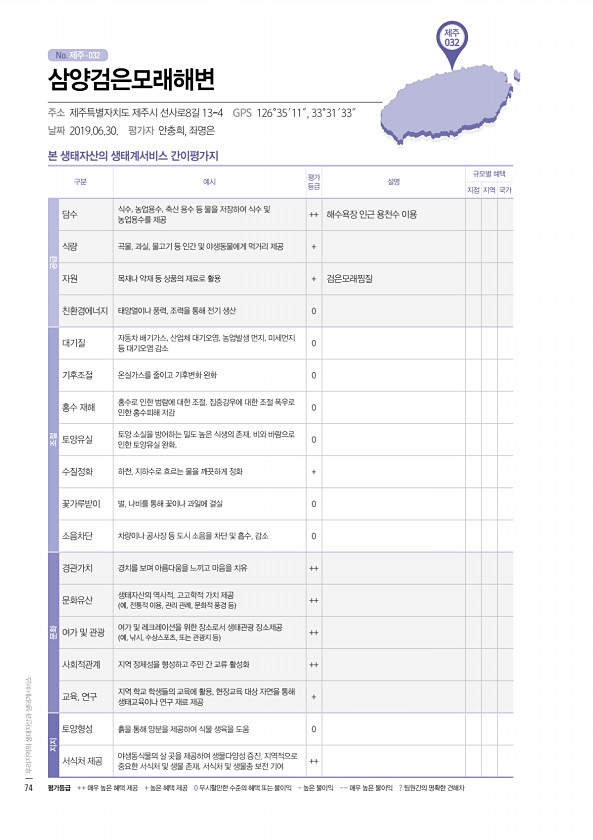 No. 제주- 제주 032 본 생태자산의 생태계서비스 간이평가지 구분 예시 평가 등급 설명 규모별 혜택 지점 지역 국가 공급 담수 식수, 농업용수, 축산 용수 등 물을 저장하여 식수 및 농업용수를 제공 ++ 해수욕장 인근 용천수 이용 식량 곡물, 과실, 물고기 등 인간 및 야생동물에게 먹거리 제공 + 자원 목재나 약재 등 상품의 재료로 활용 + 검은모래찜질 친환경에너지 태양열이나 풍력, 조력을 통해 전기 생산 0 조절 대기질 자동차 배기가스, 산업체 대기오염, 농업발생 먼지, 미세먼지 등 대기오염 감소 0 기후조절 온실가스를 줄이고 기후변화 완화 0 홍수 재해 홍수로 인한 범람에 대한 조절, 집중강우에 대한 조절 폭우로 인한 홍수피해 저감 0 토양유실 토양 소실을 방어하는 밀도 높은 식생의 존재, 비와 바람...