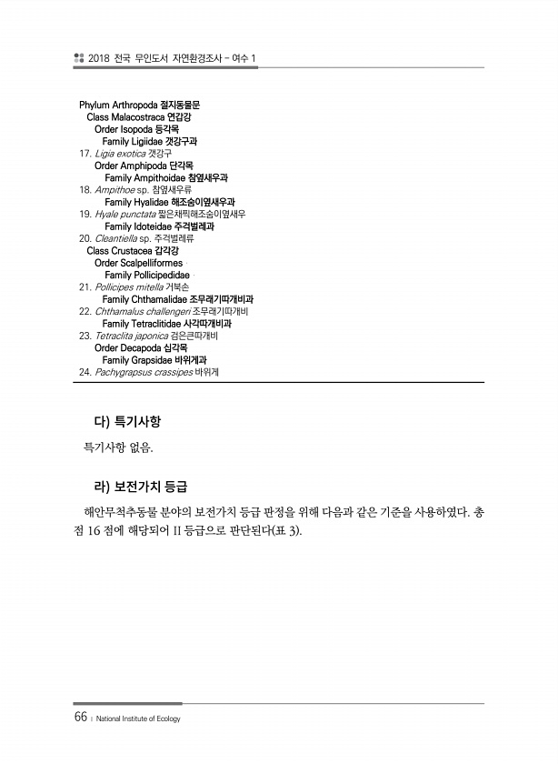 2018 전국 무인도서 자연환경조사 여수 1 66 ? National Institute of Ecology 특기사항 없음. 해안무척추동물 분야의 보전가치 등급 판정을 위해 다음과 같은 기준을 사용하였다. 총 점 16 점에 해당되어 II 등급으로 판단된다 표 3 Phylum Arthropoda 절지동물문 Class Malacostraca 연갑강 Order Isopoda 등각목 Family Ligiidae 갯강구과 17. Ligia exotica 갯강구 Order Amphipoda 단각목 Family Ampithoidae 참옆새우과 18. Ampithoe sp. 참옆새우류 Family Hyalidae 해조숨이옆새우과 19. Hyale punctata 짧은채찍해조숨이옆새우 Family Idoteidae 주걱벌레과...