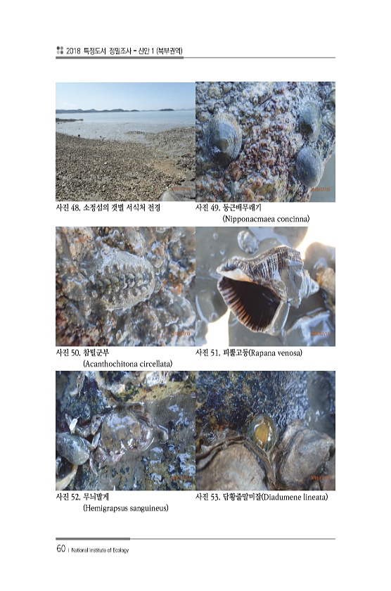 2018 특정도서 정밀조사 신안 1 북부권역 60 ? National Institute of Ecology 사진 48. 소정섬의 갯벌 서식처 전경 사진 49. 둥근배무래기 Nipponacmaea concinna 사진 50. 참털군부 Acanthochitona circellata 사진 51. 피뿔고둥 Rapana venosa 사진 52. 무늬발게 Hemigrapsus sanguineus 사진 53. 담황줄말미잘 Diadumene lineata