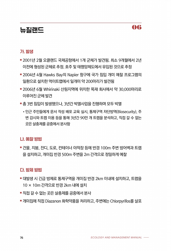 76 ECOLOGY AND MANAGEMENT MANUAL 가. 발생 ■ 2001년 2월 오클랜드 국제공항에서 1개 군체가 발견됨. 최소 9개월에서 2년 이전에 형성된 군체로 추정. 호주 및 태평양제도에서 유입된 것으로 추정 ■ 2004년 4월 Hawks Bay의 Napier 항구에 국가 침입 개미 예찰 프로그램의 일환으로 설치한 먹이트랩에서 일개미 약 200마리가 발견됨 ■ 2006년 6월 Whirinaki 산림지역에 위치한 목재 회사에서 약 30,000마리로 이루어진 군체 발견 ■ 총 3번 침입이 발생했으나, 3년간 박멸사업을 진행하며 모두 박멸 ?인근 주민들에게 문서 작성 배포 교육 실시, 통제구역 차단방역 Biosecurity , 주 변 감시와 트랩 이용 등을 통해 3년간 90만 개 트랩을 분석하고,...