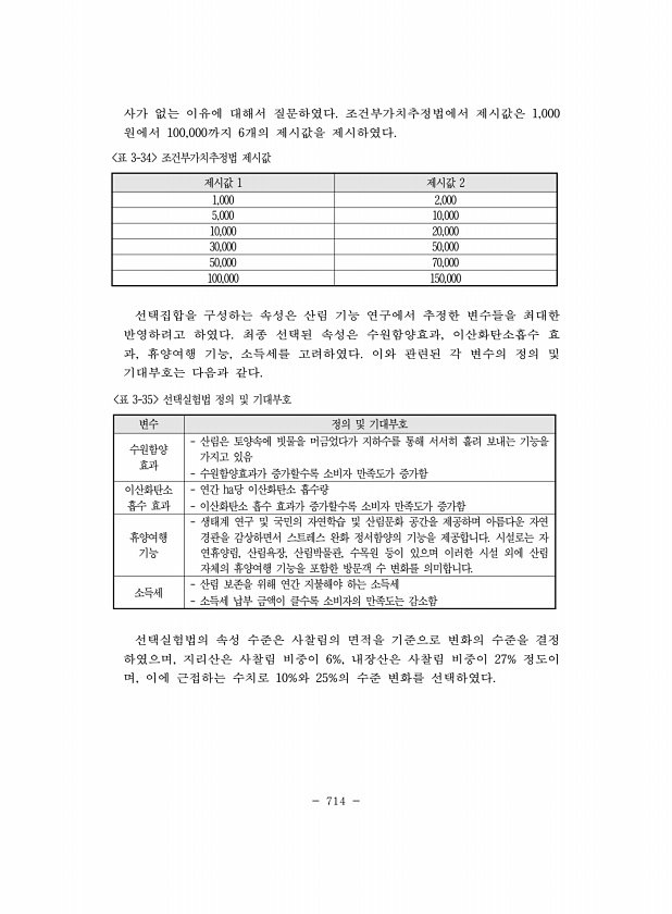 714 사가 없는 이유에 대해서 질문하였다. 조건부가치추정법에서 제시값은 1,000 원에서 100,000까지 6개의 제시값을 제시하였다. 제시값 1 제시값 2 1,000 2,000 5,000 10,000 10,000 20,000 30,000 50,000 50,000 70,000 100,000 150,000 표 3-34 조건부가치추정법 제시값 선택집합을 구성하는 속성은 산림 기능 연구에서 추정한 변수들을 최대한 반영하려고 하였다. 최종 선택된 속성은 수원함양효과, 이산화탄소흡수 효 과, 휴양여행 기능, 소득세를 고려하였다. 이와 관련된 각 변수의 정의 및 기대부호는 다음과 같다. 변수 정의 및 기대부호 수원함양 효과 산림은 토양속에 빗물을 머금었다가 지하수를 통해 서서히 흘려 보내는 기능을 가지고 있음 수원함...