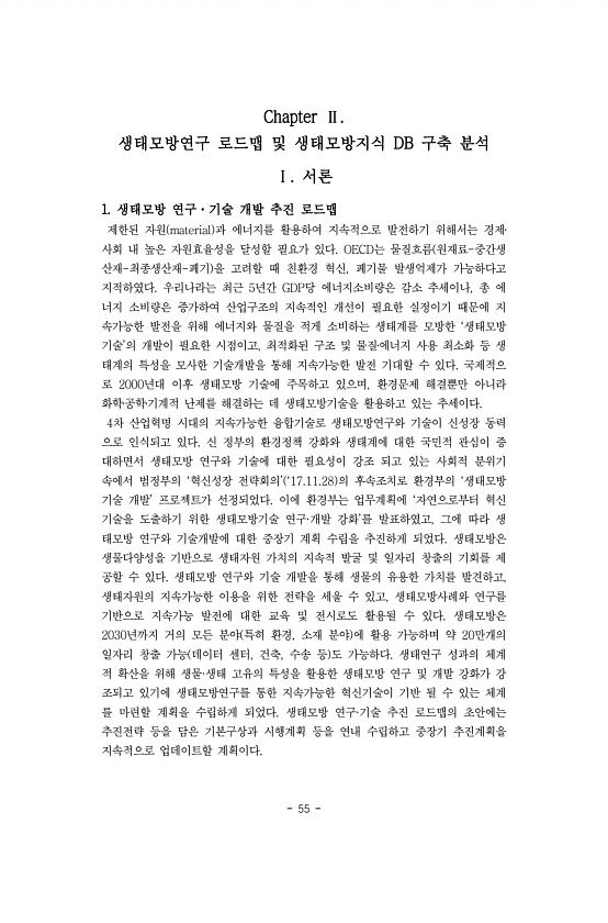 55 Chapter Ⅱ. 생태모방연구 로드맵 및 생태모방지식 DB 구축 분석 Ⅰ. 서론 1. 생태모방 연구·기술 개발 추진 로드맵 제한된 자원 material 과 에너지를 활용하여 지속적으로 발전하기 위해서는 경제? 사회 내 높은 자원효율성을 달성할 필요가 있다. OECD는 물질흐름 원재료-중간생 산재-최종생산재-폐기 을 고려할 때 친환경 혁신, 폐기물 발생억제가 가능하다고 지적하였다. 우리나라는 최근 5년간 GDP당 에너지소비량은 감소 추세이나, 총 에 너지 소비량은 증가하여 산업구조의 지속적인 개선이 필요한 실정이기 때문에 지 속가능한 발전을 위해 에너지와 물질을 적게 소비하는 생태계를 모방한 ‘생태모방 기술’의 개발이 필요한 시점이고, 최적화된 구조 및 물질?에너지 사용 최소화 등 생 태계의 특성을 모...