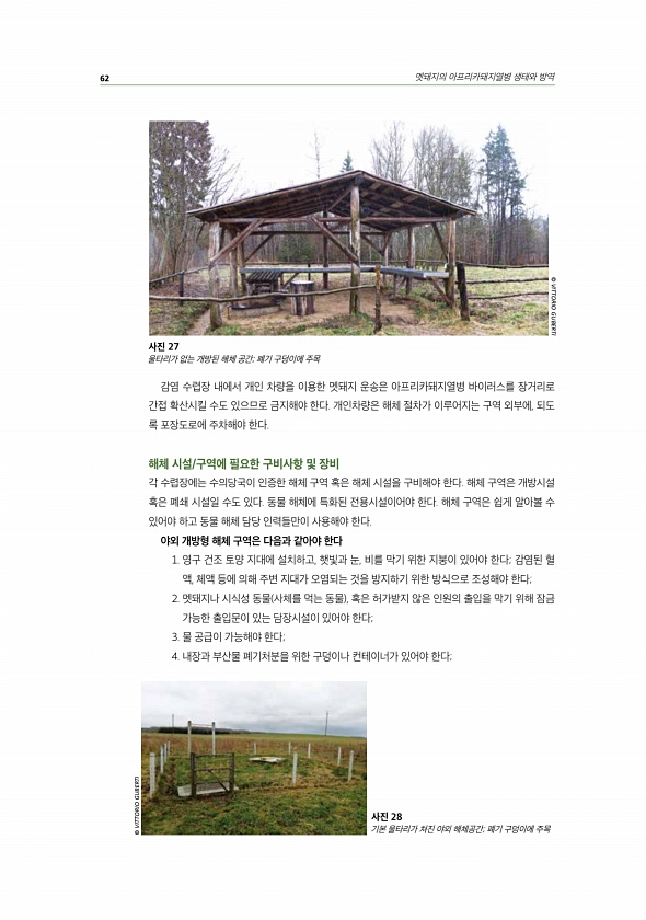 62 멧돼지의 아프리카돼지열병 생태와 방역 감염 수렵장 내에서 개인 차량을 이용한 멧돼지 운송은 아프리카돼지열병 바이러스를 장거리로 간접 확산시킬 수도 있으므로 금지해야 한다. 개인차량은 해체 절차가 이루어지는 구역 외부에, 되도 록 포장도로에 주차해야 한다. 해체 시설/구역에 필요한 구비사항 및 장비 각 수렵장에는 수의당국이 인증한 해체 구역 혹은 해체 시설을 구비해야 한다. 해체 구역은 개방시설 혹은 폐쇄 시설일 수도 있다. 동물 해체에 특화된 전용시설이어야 한다. 해체 구역은 쉽게 알아볼 수 있어야 하고 동물 해체 담당 인력들만이 사용해야 한다. 야외 개방형 해체 구역은 다음과 같아야 한다 1. 영구 건조 토양 지대에 설치하고, 햇빛과 눈, 비를 막기 위한 지붕이 있어야 한다; 감염된 혈 액, 체액 등...