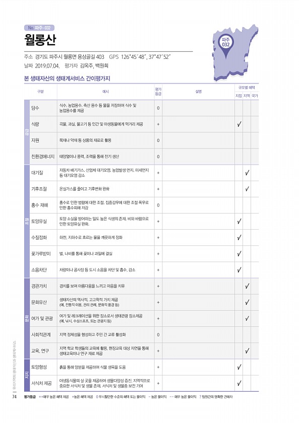 No. 파주- 파주 032 본 생태자산의 생태계서비스 간이평가지 구분 예시 평가 등급 설명 규모별 혜택 지점 지역 국가 공급 담수 식수, 농업용수, 축산 용수 등 물을 저장하여 식수 및 농업용수를 제공 0 식량 곡물, 과실, 물고기 등 인간 및 야생동물에게 먹거리 제공 + √ 자원 목재나 약재 등 상품의 재료로 활용 0 친환경에너지 태양열이나 풍력, 조력을 통해 전기 생산 0 조절 대기질 자동차 배기가스, 산업체 대기오염, 농업발생 먼지, 미세먼지 등 대기오염 감소 + √ 기후조절 온실가스를 줄이고 기후변화 완화 + √ 홍수 재해 홍수로 인한 범람에 대한 조절, 집중강우에 대한 조절 폭우로 인한 홍수피해 저감 0 토양유실 토양 소실을 방어하는 밀도 높은 식생의 존재, 비와 바람으로 인한 토양유실 완화, + ...