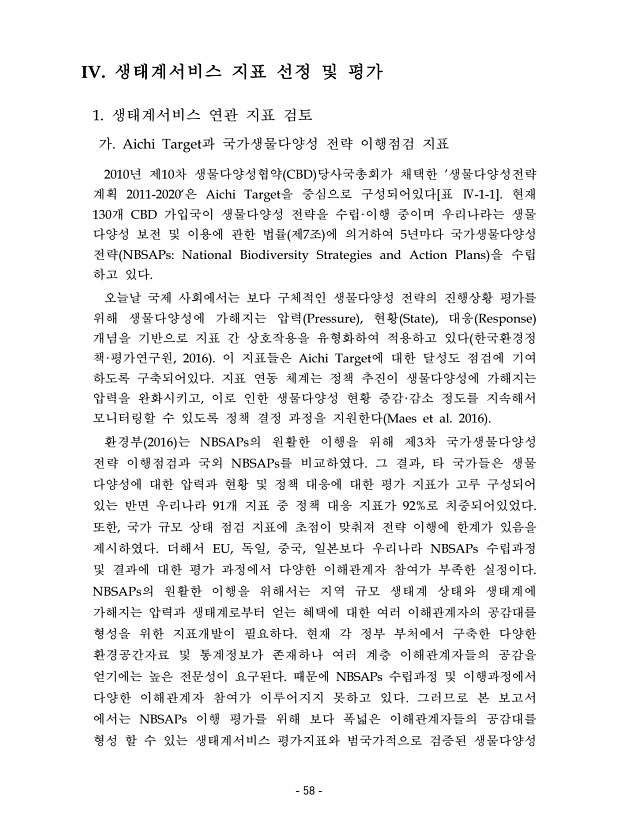 IV. 생태계서비스 지표 선정 및 평가 1. 생태계서비스 연관 지표 검토 가. Aichi Target과 국가생물다양성 전략 이행점검 지표 2010년 제10차 생물다양성협약 CBD 당사국총회가 채택한 ’생물다양성전략 계획 2011-2020‘은 Aichi Target을 중심으로 구성되어있다[표 Ⅳ-1-1]. 현재 130개 CBD 가입국이 생물다양성 전략을 수립·이행 중이며 우리나라는 생물 다양성 보전 및 이용에 관한 법률 제7조 에 의거하여 5년마다 국가생물다양성 전략 NBSAPsNational Biodiversity Strategies and Action Plans 을 수립 하고 있다. 오늘날 국제 사회에서는 보다 구체적인 생물다양성 전략의 진행상황 평가를 위해 생물다양성에 가해지는 압력 Pressure , ...