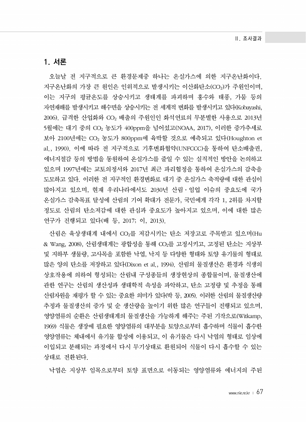 Ⅱ. 조사결과 www.nie.re.kr ? 67 1. 서론 오늘날 전 지구적으로 큰 환경문제중 하나는 온실가스에 의한 지구온난화이다. 지구온난화의 가장 큰 원인은 인위적으로 발생시키는 이산화탄소 CO2 가 주원인이며, 이는 지구의 평균온도를 상승시키고 생태계를 파괴하며 홍수와 태풍, 가뭄 등의 자연재해를 발생시키고 해수면을 상승시키는 전 세계적 변화를 발생시키고 있다 Kobayashi, 2006 급격한 산업화와 CO2 배출의 주원인인 화석연료의 무분별한 사용으로 2013년 5월에는 대기 중의 CO2 농도가 400ppm을 넘어섰고 NOAA, 2017 , 이러한 증가추세로 보아 2100년에는 CO2 농도가 800ppm에 육박할 것으로 예측되고 있다 Houghton et al., 1990 이에 따라 전 지구적으로...