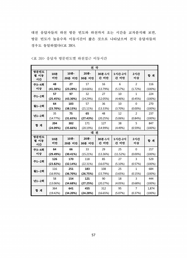 57 대전 응답자들의 하천 방문 빈도와 하천까지 오는 시간을 교차분석해 보면, 방문 빈도가 높을수록 이동시간이 짧은 것으로 나타났으며 전국 응답자들의 경우도 동일하였다 표 39 표 39 응답자 방문빈도별 하천접근 이동시간 전 국 방문빈도 별 이동 시간 10분 미만 10분- 20분 미만 20분- 30분 미만 30분-1시 간 미만 1시간-2시 간 미만 2시간 이상 합 계 주34회 이상 48 41.38% 27 23.28% 17 14.66% 16 13.79% 6 5.17% 2 1.72% 116 100% 주12회 57 25.45% 97 43.30% 32 14.29% 27 12.05% 10 4.46% 1 0.45% 224 100% 월12회 64 23.70% 103 38.15% 57 21.11% 36 13.33% 10 ...
