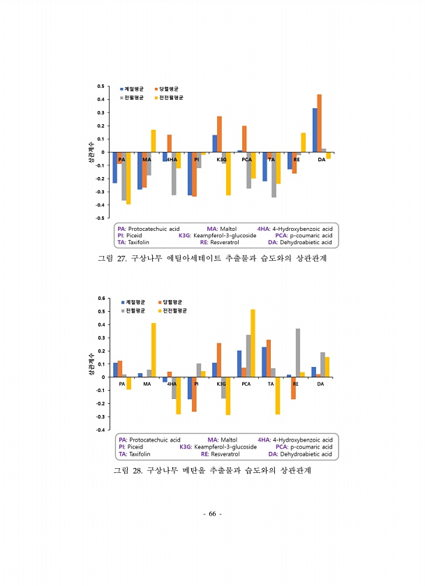 66 그림 27. 구상나무 에틸아세테이트 추출물과 습도와의 상관관계 그림 28. 구상나무 메탄올 추출물과 습도와의상관관계