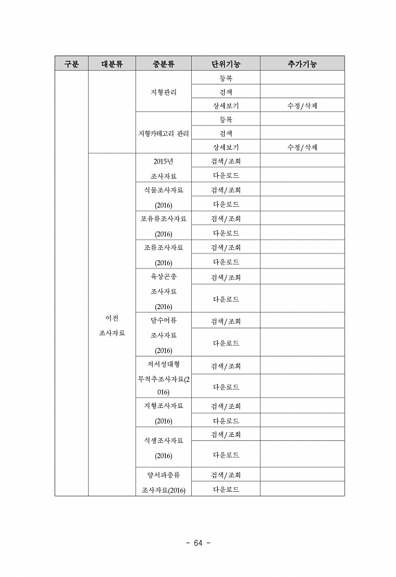 64 구분 대분류 중분류 단위기능 추가기능 지형관리 등록 검색 상세보기 수정/삭제 지형카테고리 관리 등록 검색 상세보기 수정/삭제 이전 조사자료 2015년 조사자료 검색/조회 다운로드 식물조사자료 2016 검색/조회 다운로드 포유류조사자료 2016 검색/조회 다운로드 조류조사자료 2016 검색/조회 다운로드 육상곤충 조사자료 2016 검색/조회 다운로드 담수어류 조사자료 2016 검색/조회 다운로드 저서성대형 무척추조사자료 2 016 검색/조회 다운로드 지형조사자료 2016 검색/조회 다운로드 식생조사자료 2016 검색/조회 다운로드 양서파충류 조사자료 2016 검색/조회다운로드