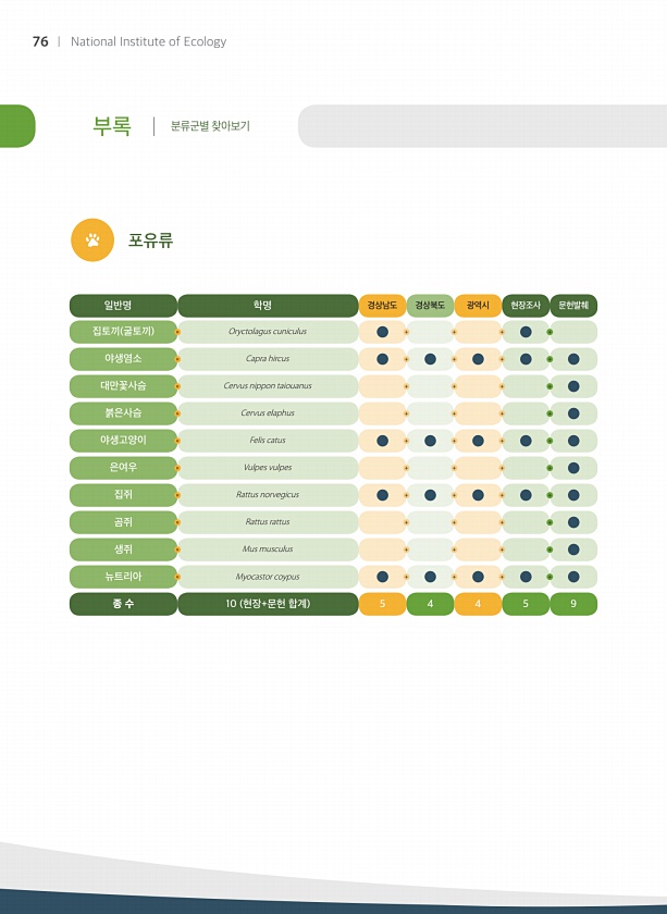 부록 분류군별 찾아보기 포유류 집토끼 굴토끼 Oryctolagus cuniculus 야생염소 Capra hircus 대만꽃사슴 Cervus nippon taiouanus 붉은사슴 Cervus elaphus 야생고양이 Felis catus 은여우 Vulpes vulpes 집쥐 Rattus norvegicus 곰쥐 Rattus rattus 생쥐 Mus musculus 뉴트리아 Myocastor coypus 종 수 10 현장+문헌 합계 5 4 4 5 9 일반명 학명 경상남도 경상북도 광역시 현장조사 문헌발췌 76 National Institute ofEcology