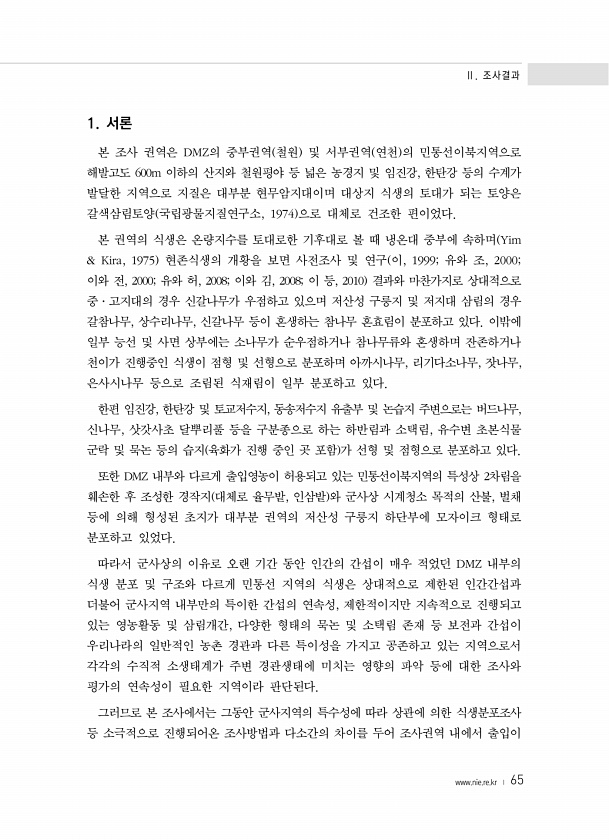 Ⅱ. 조사결과 www.nie.re.kr ? 65 1. 서론 본 조사 권역은 DMZ의 중부권역 철원 및 서부권역 연천 의 민통선이북지역으로 해발고도 600m 이하의 산지와 철원평야 등 넓은 농경지 및 임진강, 한탄강 등의 수계가 발달한 지역으로 지질은 대부분 현무암지대이며 대상지 식생의 토대가 되는 토양은 갈색삼림토양 국립광물지질연구소, 1974 으로 대체로 건조한 편이었다. 본 권역의 식생은 온량지수를 토대로한 기후대로 볼 때 냉온대 중부에 속하며 Yim & Kira, 1975 현존식생의 개황을 보면 사전조사 및 연구 이, 1999; 유와 조, 2000; 이와 전, 2000; 유와 허, 2008; 이와 김, 2008; 이 등, 2010 결과와 마찬가지로 상대적으로 중·고지대의 경우 신갈나무가 우점하고 있으며...