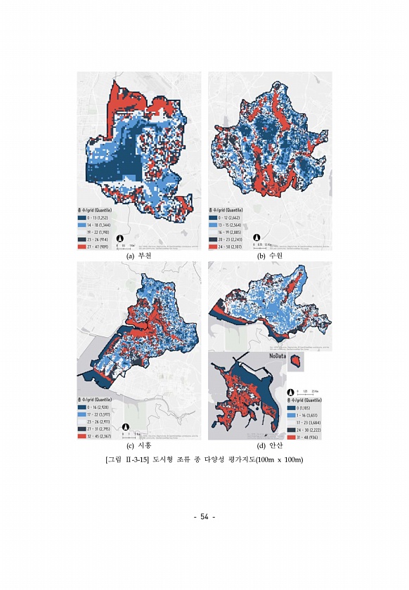 54 a 부천 b 수원 c 시흥 d 안산 [그림 Ⅱ-3-15] 도시형 조류 종 다양성 평가지도 100m x 100m