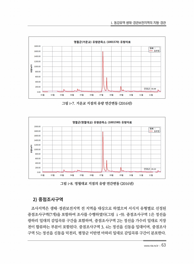 i. 동강유역 생태·경관보전지역의 지형·경관 www.nie.re.kr ? 63 그림 i-7. 거운교 지점의 유량 연간변동 2016년 그림 i-8. 영월대교 지점의 유량 연간변동 2016년 2 조사지역은 생태·경관보전지역 전 지역을 대상으로 하였으며 서식지 유형별로 선정된 중점조사구역 7개 을 포함하여 조사를 수행하였다 그림 ⅰ-9 중점조사구역 1은 정선읍 광하리 일대의 감입곡류 구간을 포함하며, 중점조사구역 2는 정선읍 가수리 일대로 지장 천이 합류하는 부분이 포함된다. 중점조사구역 3, 4는 정선읍 신동읍 일대이며, 중점조사 구역 5는 정선읍 신동읍 덕천리, 평창군 미탄면 마하리 일대로 감입곡류 구간이분포한다.