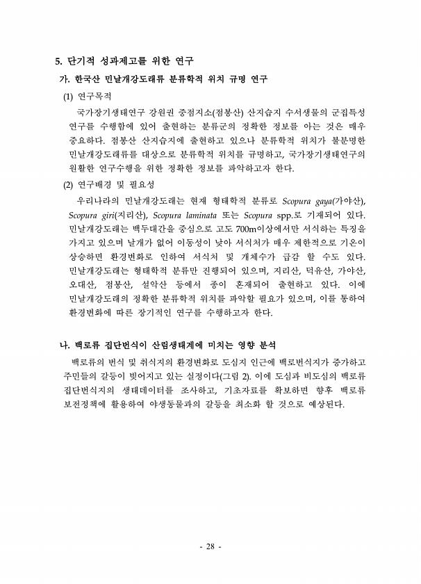 28 5. 단기적 성과제고를 위한 연구 가. 한국산 민날개강도래류 분류학적 위치 규명 연구 1 연구목적 국가장기생태연구 강원권 중점지소 점봉산 산지습지 수서생물의 군집특성 연구를 수행함에 있어 출현하는 분류군의 정확한 정보를 아는 것은 매우 중요하다. 점봉산 산지습지에 출현하고 있으나 분류학적 위치가 불분명한 민날개강도래류를 대상으로 분류학적 위치를 규명하고, 국가장기생태연구의 원활한 연구수행을 위한 정확한 정보를 파악하고자 한다. 2 연구배경 및 필요성 우리나라의 민날개강도래는 현재 형태학적 분류로 Scopura gaya 가야산 , Scopura giri 지리산 , Scopura laminata 또는 Scopura spp.로 기재되어 있다. 민날개강도래는 백두대간을 중심으로 고도 700m이상에서만 서식하는...