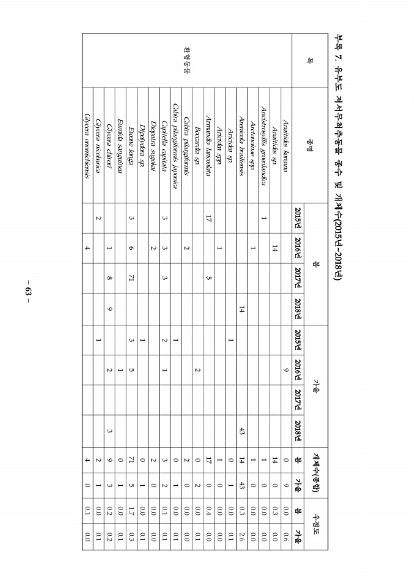 목 종명 봄 가을 개체수 종합 우점도 2015년 2016년 2017년 2018년 2015년 2016년 2017년 2018년 봄 가을 봄 가을 환형동물 Anaitides koreana 9 0 9 0.0 0.6 Anaitides sp. 14 14 0 0.3 0.0 Ancistrosyllis groenlandica 1 1 0 0.0 0.0 Arctonoinae spp. 1 1 0 0.0 0.0 Arenicola brailiensis 14 43 14 43 0.3 2.6 Aricidea sp. 1 0 1 0.0 0.1 Aricidea spp. 1 1 0 0.0 0.0 Armandia lanceolata 17 5 17 0 0.4 0.0 Boccardia sp. 2 0 2 0.0 0.1 Cabira pilargiform...