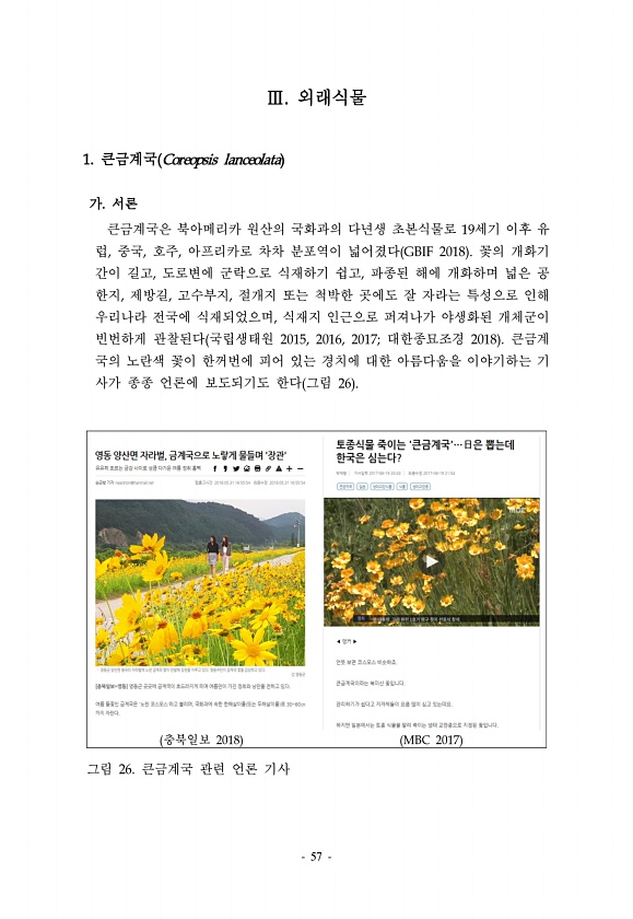 57 Ⅲ. 외래식물 1. 큰금계국 Coreopsis lanceolata 가. 서론 큰금계국은 북아메리카 원산의 국화과의 다년생 초본식물로 19세기 이후 유 럽, 중국, 호주, 아프리카로 차차 분포역이 넓어졌다 GBIF 2018 꽃의 개화기 간이 길고, 도로변에 군락으로 식재하기 쉽고, 파종된 해에 개화하며 넓은 공 한지, 제방길, 고수부지, 절개지 또는 척박한 곳에도 잘 자라는 특성으로 인해 우리나라 전국에 식재되었으며, 식재지 인근으로 퍼져나가 야생화된 개체군이 빈번하게 관찰된다 국립생태원 2015, 2016, 2017; 대한종묘조경 2018 큰금계 국의 노란색 꽃이 한꺼번에 피어 있는 경치에 대한 아름다움을 이야기하는 기 사가 종종 언론에 보도되기도 한다 그림 26 충북일보 2018 MBC 2017 그림...