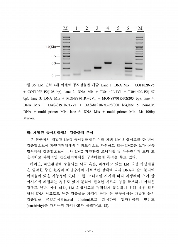59 그림 36. LM 면화 4개 이벤트 동시검출법 개발. Lane 1DNA Mix + COT102R-V5 + COT102R-P2 108 bp , lane 2DNA Mix + T304-40L-JV1 + T304-40L-P2 157 bp , lane 3DNA Mix + MON88701R?JV1 + MON88701R-P2 205 bp , lane 4DNA Mix + DAS-81910-7L-V1 + DAS-81910-7L-P3 300 bp ,lane 5non-LM DNA + multi primer Mix, lane 6DNA Mix + multi primer Mix. M100bp Marker. 라. 개발된 동시검출법의 검출한계 분석 본 연구에서 개발된 LMO 동시검출법은 여러 개의 LM 의심시료를 한 번에 검출함으...