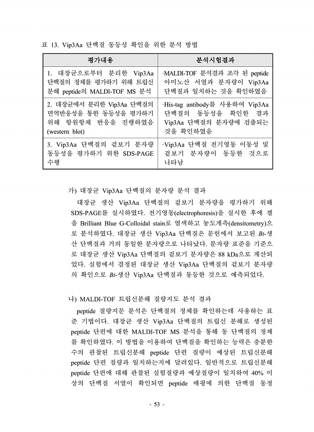 53 표 13. Vip3Aa 단백질 동등성 확인을 위한 분석 방법 평가내용 분석시험결과 1. 대장균으로부터 분리한 Vip3Aa 단백질의 정체를 평가하기 위해 트립신 분해 peptide의 MALDI-TOF MS 분석 ·MALDI-TOF 분석결과 조각 된 peptide 아미노산 서열과 분자량이 Vip3Aa 단백질과 일치하는 것을 확인하였음 2. 대장균에서 분리한 Vip3Aa 단백질의 면역반응성을 통한 동등성을 평가하기 위해 항원항체 반응을 진행하였음 western blot ·His-tag antibody를 사용하여 Vip3Aa 단백질의 동등성을 확인한 결과 Vip3Aa 단백질의 분자량에 검출되는 것을 확인하였음 3. Vip3Aa 단백질의 겉보기 분자량 동등성을 평가하기 위한 SDS-PAGE 수행 ·Vip3Aa ...