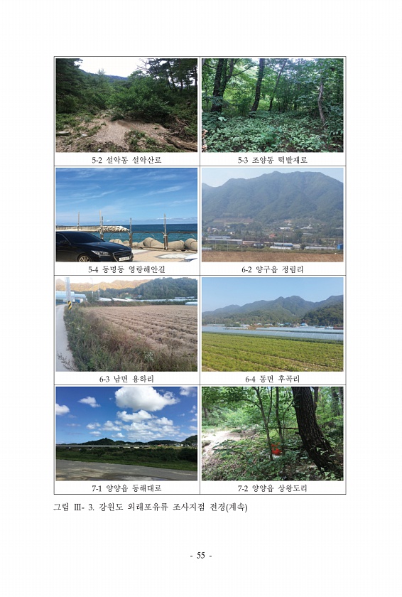2017 DMZ 일원 생태계 조사 민통선이북지역 서부평야권역 66 ? National Institute of Ecology 가능하거나 최대한 접근이 가능한 각 식생유형에 따라 해당 식생의 수직적 구조와 더불어 현장에서 확인이 가능한 범위 내에서의 종조성 조사 및 물리적 환경, 해당 경관 내에서 각 소생태계의 기능 및 역할에 중점을 두어 현장 조사를 시행하였다. 2. 조사 지역 및 방법 가. 조사지역 1 조사지 개황 가 빙애코스 행정구역상 연천군 중면 삼곶리고동골태풍전망대에 이르는 구간으로 전체적으로 저산성 구릉지와 임진강을 중심으로한 수계가 발달한 지역이다. 전체적인 식생상관은 참나무 상수리나무군락, 상수리나무-신갈나무군락 군락의 초기 2차림이 대부분의 구릉성 산지에 분포하고 있으며 잣나무, 자작나무, 밤나...