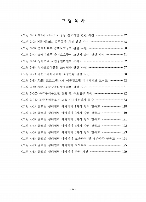 iv 그 림 목 차 그림 3-1 제3차 NIE-CER 공동 심포지엄 관련 사진 ···································42 그림 3-2 NIE-NParks 업무협약 체결 관련 사진 ···········································48 그림 3-3 숭게이브루 습지보호구역 관련 사진 ·············································50 그림 3-4 숭게이브루 습지보호구역 크란지 습지 관련 사진 ·····················51 그림 3-5 싱가포르 국립공원위원회 조직도 ···················································52 그림 3-6 싱가포르식물원 조성현황 관련 사진 ·····...