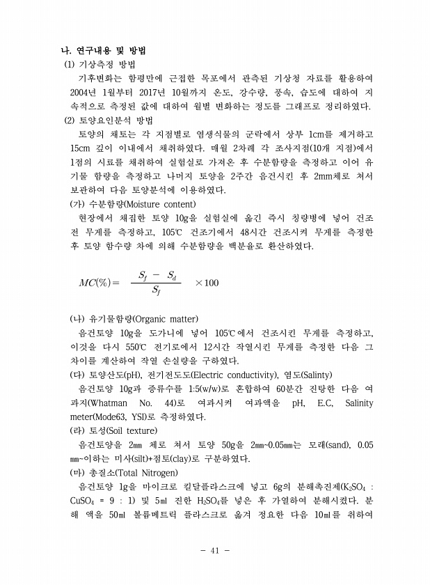 41 나. 연구내용 및 방법 1 기상측정 방법 기후변화는 함평만에 근접한 목포에서 관측된 기상청 자료를 활용하여 2004년 1월부터 2017년 10월까지 온도, 강수량, 풍속, 습도에 대하여 지 속적으로 측정된 값에 대하여 월별 변화하는 정도를 그래프로 정리하였다. 2 토양요인분석 방법 토양의 채토는 각 지점별로 염생식물의 군락에서 상부 1cm를 제거하고 15cm 깊이 이내에서 채취하였다. 매월 2차례 각 조사지점 10개 지점 에서 1점의 시료를 채취하여 실험실로 가져온 후 수분함량을 측정하고 이어 유 기물 함량을 측정하고 나머지 토양을 2주간 음건시킨 후 2mm체로 쳐서 보관하여 다음 토양분석에 이용하였다. 가 수분함량 Moisture content 현장에서 채집한 토양 10g을 실험실에 옮긴 즉시 칭량병...