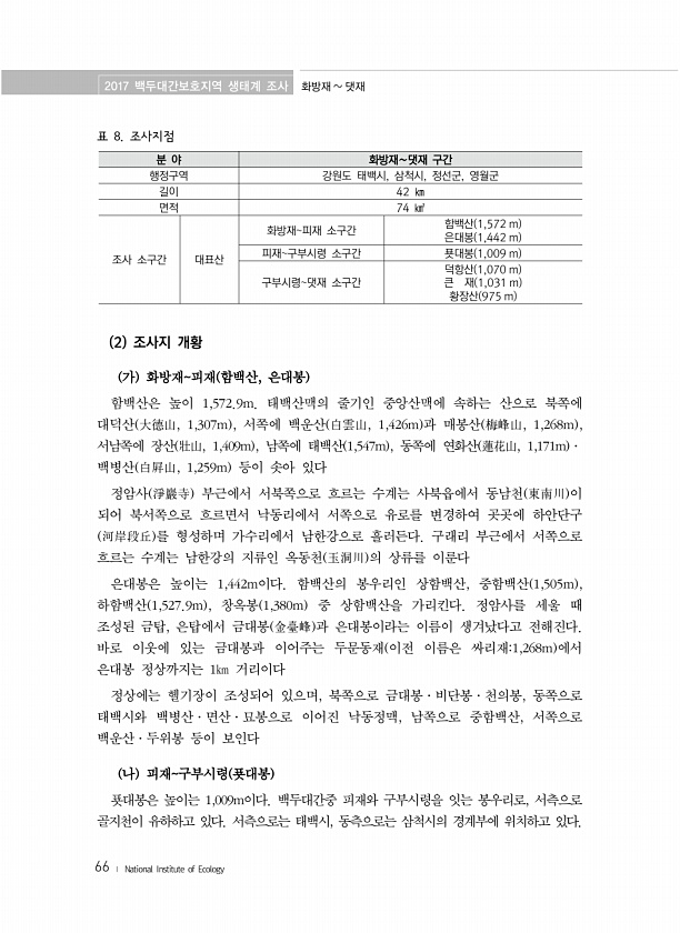 2017 백두대간보호지역 생태계 조사 화방재 댓재 66 ? National Institute of Ecology 표 8. 조사지점 분 야 화방재∼댓재 구간 행정구역 강원도 태백시, 삼척시, 정선군, 영월군 길이 42 ㎞ 면적 74 ㎢ 조사 소구간 대표산 화방재피재 소구간 함백산 1,572 m 은대봉 1,442 m 피재구부시령 소구간 푯대봉 1,009 m 구부시령댓재 소구간 덕항산 1,070 m 큰 재 1,031 m 황장산 975 m 2 조사지 개황 가 화방재피재 함백산, 은대봉 함백산은 높이 1,572.9m. 태백산맥의 줄기인 중앙산맥에 속하는 산으로 북쪽에 대덕산 大德山, 1,307m , 서쪽에 백운산 白雲山, 1,426m 과 매봉산 梅峰山, 1,268m , 서남쪽에 장산 壯山, 1,409m , 남쪽에 태...