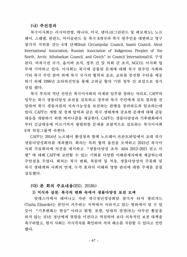 67 나 추진경과 북극이사회는 러시아연방, 캐나다, 미국, 덴마크 그린란드 및 페로제도 , 노르 웨이, 스웨덴, 핀란드, 아이슬란드 등 북극 8개국과 북극 원주민을 대변하고 영구 참가자 지위를 갖는 6개 단체 Inuit Circumpolar Council, Saami Council, Aleut International Association, Russian Association of Indigenous Peoples of the North, Arctic Athabaskan Council, and Gwich’in Council International 로 구성 된다. 비북극권 국가, 옵서버 조직, 정부 간 및 의회 간 조직, NGO도 이사회 업 무에 기여하고 있다. 이사회는 북극에 공통된 문제에 대해 북극 원주...