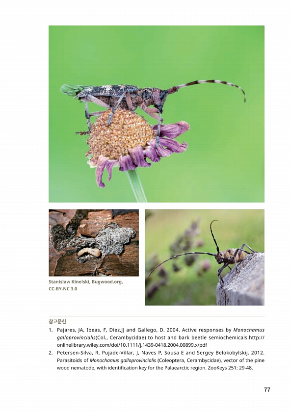 77 참고문헌 1. Pajares, JA, Ibeas, F, Diez,JJ and Gallego, D. 2004. Active responses by Monochamus galloprovincialis Col., Cerambycidae to host and bark beetle semiochemicals.http// onlinelibrary.wiley.com/doi/10.1111/j.1439-0418.2004.00899.x/pdf 2. Petersen-Silva, R, Pujade-Villar, J, Naves P, Sousa E and Sergey Belokobylskij. 2012. Parasitoids of Monochamus galloprovincialis Coleoptera, Cerambycidae...