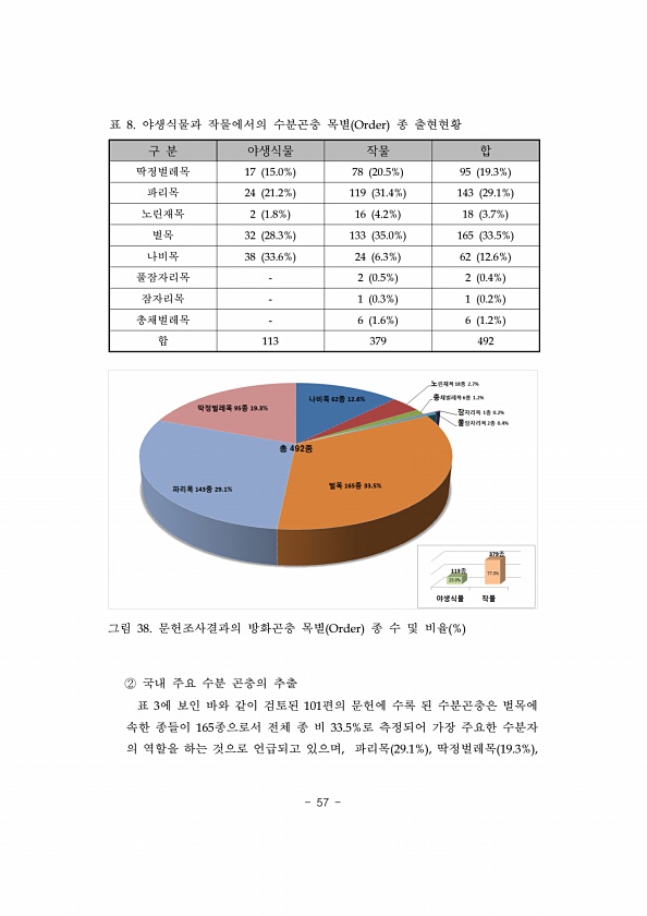57 구 분 야생식물 작물 합 딱정벌레목 17 15.0% 78 20.5% 95 19.3% 파리목 24 21.2% 119 31.4% 143 29.1% 노린재목 2 1.8% 16 4.2% 18 3.7% 벌목 32 28.3% 133 35.0% 165 33.5% 나비목 38 33.6% 24 6.3% 62 12.6% 풀잠자리목 2 0.5% 2 0.4% 잠자리목 1 0.3% 1 0.2% 총채벌레목 6 1.6% 6 1.2% 합 113 379 492 표 8. 야생식물과 작물에서의 수분곤충 목별 Order 종 출현현황 그림 38. 문헌조사결과의 방화곤충 목별 Order 종 수 및 비율 % ② 국내 주요 수분 곤충의 추출 표 3에 보인 바와 같이 검토된 101편의 문헌에 수록 된 수분곤충은 벌목에 속한 종들이 165종으로서 ...