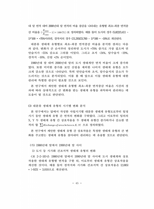 45 대 말 면적 대비 2000년대 말 면적의 비율 증감을 나타내는 유형별 최초-최종 면적증 감 비율을 × 로 정의하였다. 예를 들어 도시의 경우 5,822/3,411 1 *100 = +70%이라면, 경작지의 경우 21,293/23,760 1 *100 = -10%로 계산된다. 대분류 생태계 유형별로 최초-최종 면적증감 비율을 분석한 결과는 다음 과 같다. 변화가 큰 순서부터 정리하면 도시가 +70% 증가로 가장 컸으며 연 안습지가 -55% 감소로 그뒤를 이었다. 그리고 초지 -24%, 담수습지 -19%, 경작지 -10%, 산림 +2% 순이었다. 1980년대 말 대비 2000년대 말의 도시 생태계만 면적 비율이 크게 증가하 였다. 또한 미미한 증가를 보인 산...