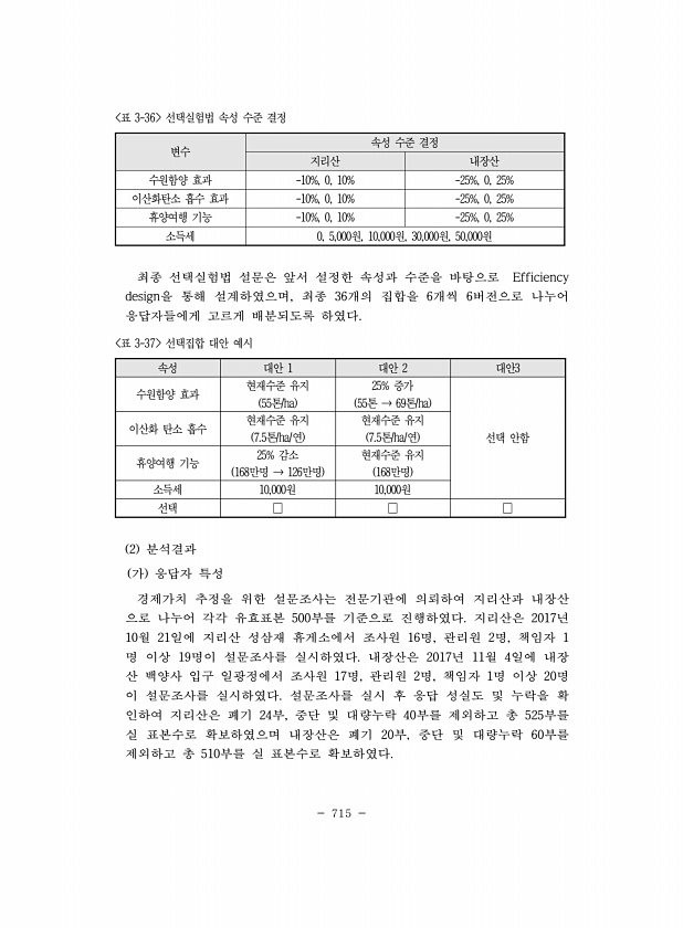 715 변수 속성 수준 결정 지리산 내장산 수원함양 효과 -10%, 0, 10% -25%, 0, 25% 이산화탄소 흡수 효과 -10%, 0, 10% -25%, 0, 25% 휴양여행 기능 -10%, 0, 10% -25%, 0, 25% 소득세 0, 5,000원, 10,000원, 30,000원, 50,000원 표 3-36 선택실험법 속성 수준 결정 최종 선택실험법 설문은 앞서 설정한 속성과 수준을 바탕으로 Efficiency design을 통해 설계하였으며, 최종 36개의 집합을 6개씩 6버전으로 나누어 응답자들에게 고르게 배분되도록 하였다. 속성 대안 1 대안 2 대안3 수원함양 효과 현재수준 유지 25% 증가 선택 안함 55톤/ha 55톤 → 69톤/ha 이산화 탄소 흡수 현재수준 유지 현재수준 유지 7.5톤...