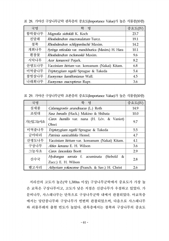 61 국명 학 명 중요도 IV 함박꽃나무 Magnolia sieboldii K. Koch 23.7 진달래 Rhododendron mucronulatum Turcz. 19.1 철쭉?im. 14.2 개회나무?im. H. Hara 1A.1 흰참꽃?im. 9.6 시닥나무 Acer komarovii Pojark. 8.2 산앵도나무?akai Kitam. 6.8 미역줄나무 TriSterygium regelii SSrague & Takeda 5.4 참빗살나무 Euonymus hamiltonianus Wall. 4.5 나래회나무 Euonymus macroSterus RuSr. 3.6 표 28. 가야산 구상나무군락 관목층의 중요도 ImSortance Value 가 높은 식물종 1A종 국명 학 명 중요도 IV 실새풀 Calam...