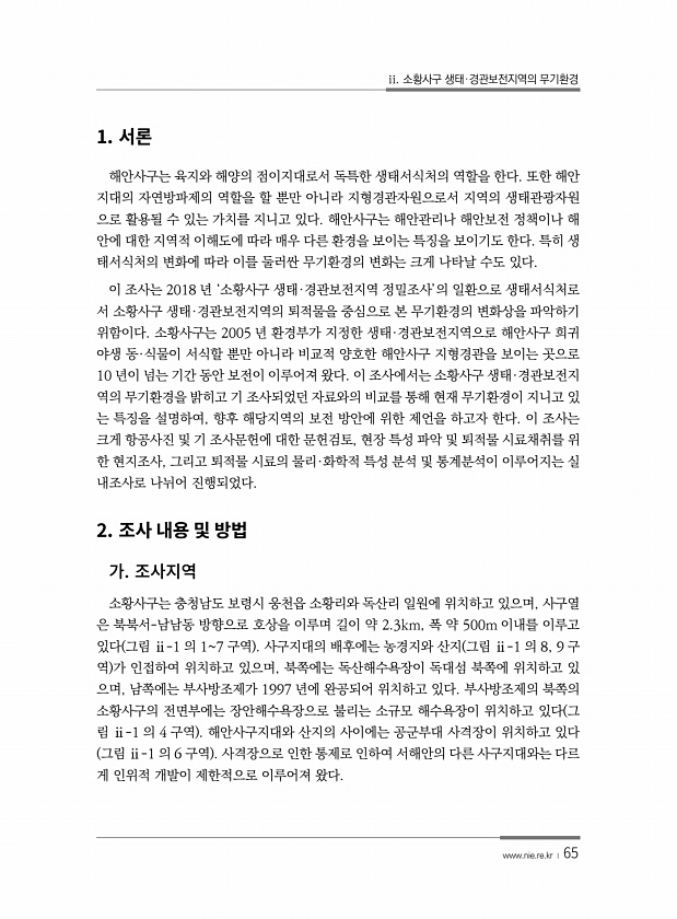 ii. 소황사구 생태·경관보전지역의 무기환경 www.nie.re.kr ? 65 1. 해안사구는 육지와 해양의 점이지대로서 독특한 생태서식처의 역할을 한다. 또한 해안 지대의 자연방파제의 역할을 할 뿐만 아니라 지형경관자원으로서 지역의 생태관광자원 으로 활용될 수 있는 가치를 지니고 있다. 해안사구는 해안관리나 해안보전 정책이나 해 안에 대한 지역적 이해도에 따라 매우 다른 환경을 보이는 특징을 보이기도 한다. 특히 생 태서식처의 변화에 따라 이를 둘러싼 무기환경의 변화는 크게 나타날 수도 있다. 이 조사는 2018 년 ‘소황사구 생태·경관보전지역 정밀조사’의 일환으로 생태서식처로 서 소황사구 생태·경관보전지역의 퇴적물을 중심으로 본 무기환경의 변화상을 파악하기 위함이다. 소황사구는 2005 년 환경부가 지정...