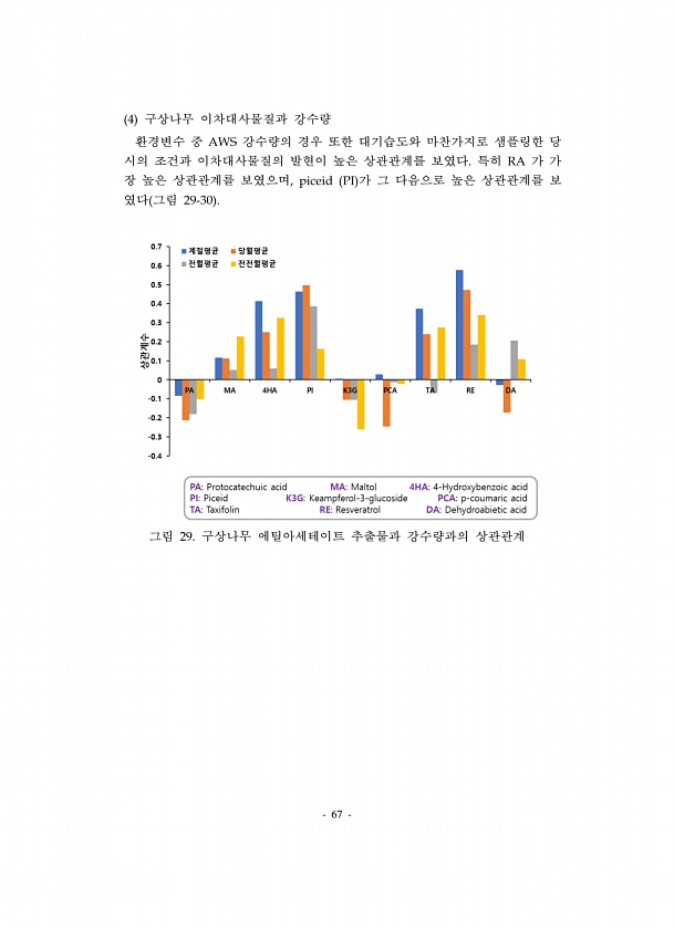67 4 구상나무 이차대사물질과 강수량 환경변수 중 AWS 강수량의 경우 또한 대기습도와 마찬가지로 샘플링한 당 시의 조건과 이차대사물질의 발현이 높은 상관관계를 보였다. 특히 RA 가 가 장 높은 상관관계를 보였으며, piceid PI 가 그 다음으로 높은 상관관계를 보 였다 그림 29-30 그림 29. 구상나무 에틸아세테이트 추출물과 강수량과의상관관계