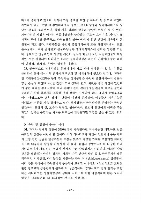 빠르게 증가하고 있으며, 미래에 가장 중요한 요인 중 하나가 될 것으로 보인다. 자연자원 채집, 오염 및 침입외래종의 경향은 생물다양성과 생태계서비스의 상 당한 감소를 초래했으며, 특히 기후 변화와 맞물려 상당한 위협이 될 수 있다. 자연자원의 채집은 여전히 생물다양성을 압박하는 주요한 요인이다. 게다가, 효 과적인 규제에도 불구하고, 환경오염은 생물다양성과 인간 건강에 계속해서 큰 위협이 되고 있다. 외래종들은 유럽과 중앙아시아의 모든 하위지역에서, 모든 분류군에서, 수가 증가했고 생물다양성과 생태계서비스에 심각한 영향을 끼친 다. 생태계는 반응하는데 상당한 시간이 걸리기 때문에 모든 직접요인들의 개별 적인, 또는 결합되어 나타나는 효과는 생물다양성과 자연이 인간에게 주는 혜택 에 만성적, 장기적, 유예된...