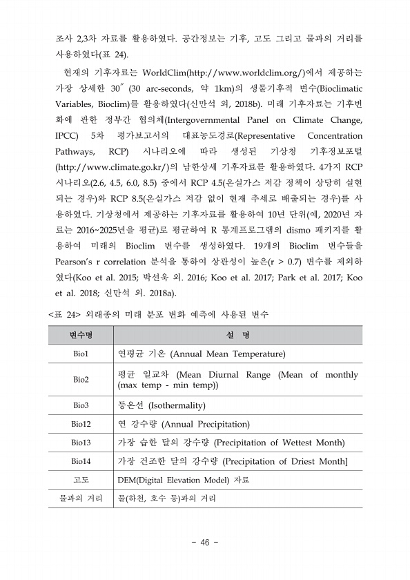 2,3 , ? ? 24 ? WorldClim http//www.worldclim.org/ 30 30 arc-seconds, 1km ? Bioclimatic Variables, Bioclim , 2018b ? ? Intergovernmental Panel on Climate Change, IPCC 5 Representative Concentration Pathways, RCP ? ? ? http//www.climate.go.kr/ ? ? 4 RCP ? 2.6, 4.5, 6.0, 8.5 RCP 4.5 RCP 8.5 ? ? 10 , 2020 20162025 ? ? R ?dismo Bioclim 19 Bioclim Pearsons r correlation r 0.7 Koo et al. 2015; 2016; Koo ...