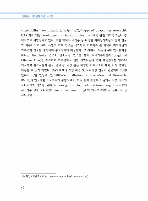 생태분야 기후변화 적응 사례집 60 vulnerability determination , 응용 적응연구 applied adaptation research , DAS 지표 개발 development of indicators for the DAS 관련 과학연구들이 정 책적으로 뒷받침되고 있다. 또한 학계와 주정부 등 다양한 이해당사자들의 참여 연구 가 이루어지고 있다. 독일의 기후 연구는 국가단위 기후예측 뿐 아니라 지역차원의 기후변화 정보를 생산하여 수요자에게 제공한다. 그 사례로, 독일의 4대 연구협회중 하나인 Helmholtz 연구소 컨소시엄 연구를 통해 지역기후아틀라스 Regional Climate Atlas 를 제작하여 기후변화로 인한 지역차원의 변화 예측정보를 웹14 에 게시하여 접속자들이 온도, 강...